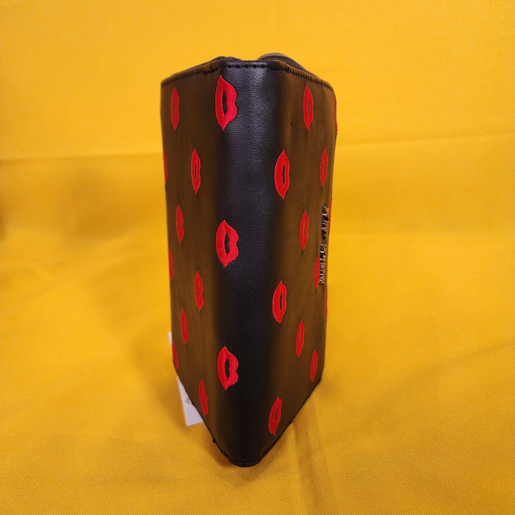 * Black Faux Leather Exterior with Embroidered Kiss Lips Accents