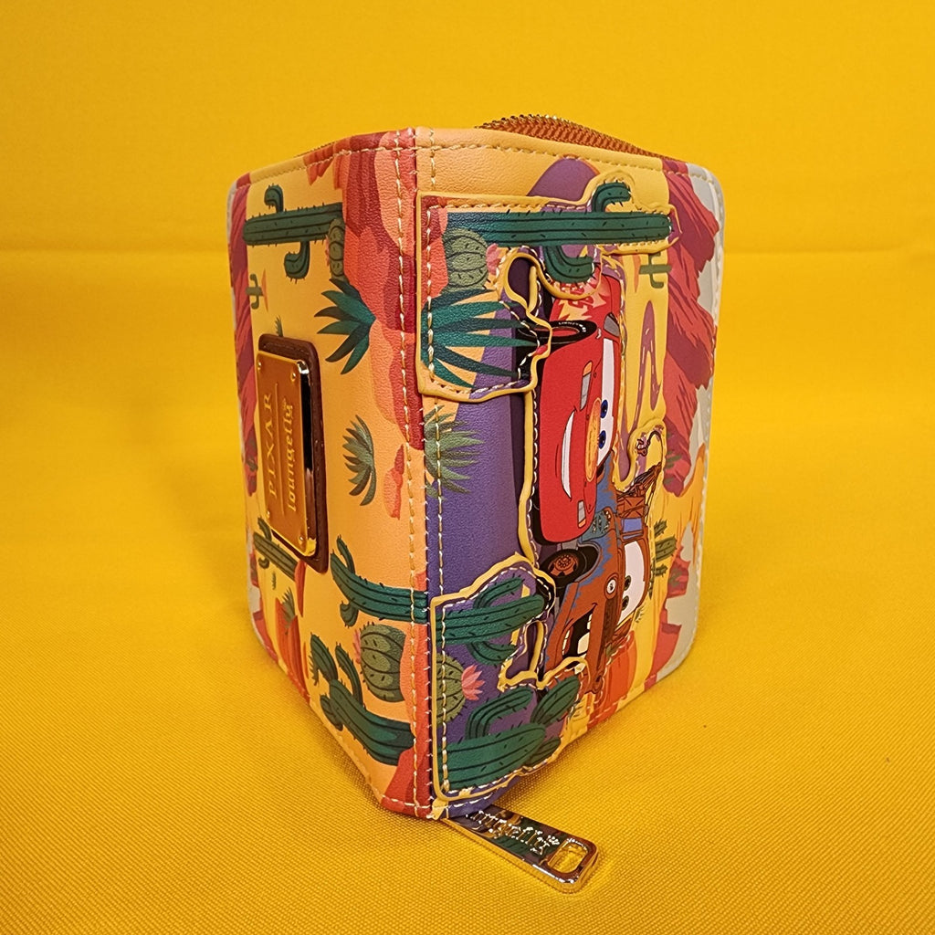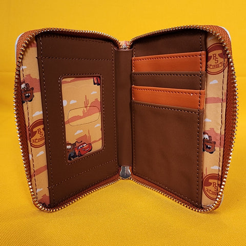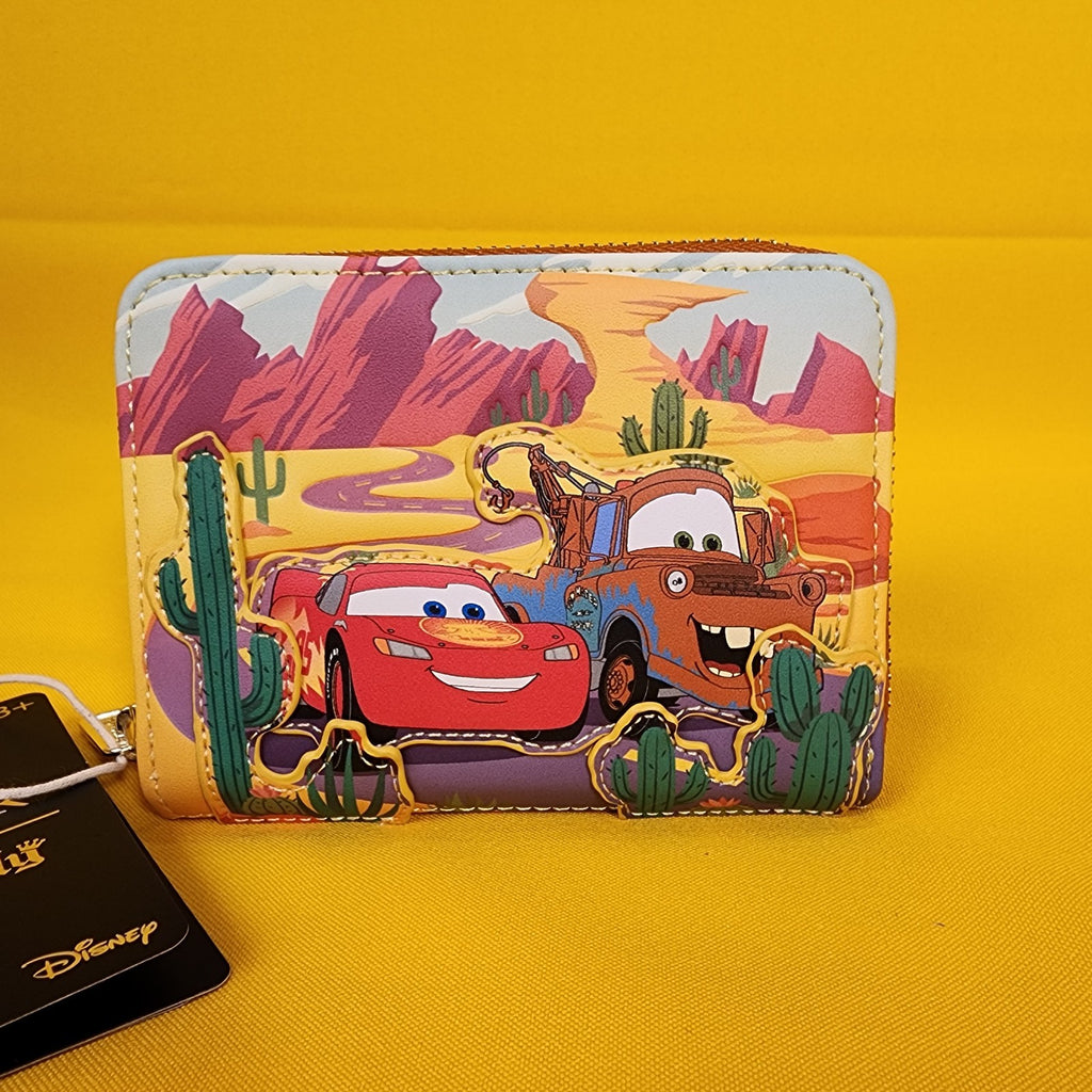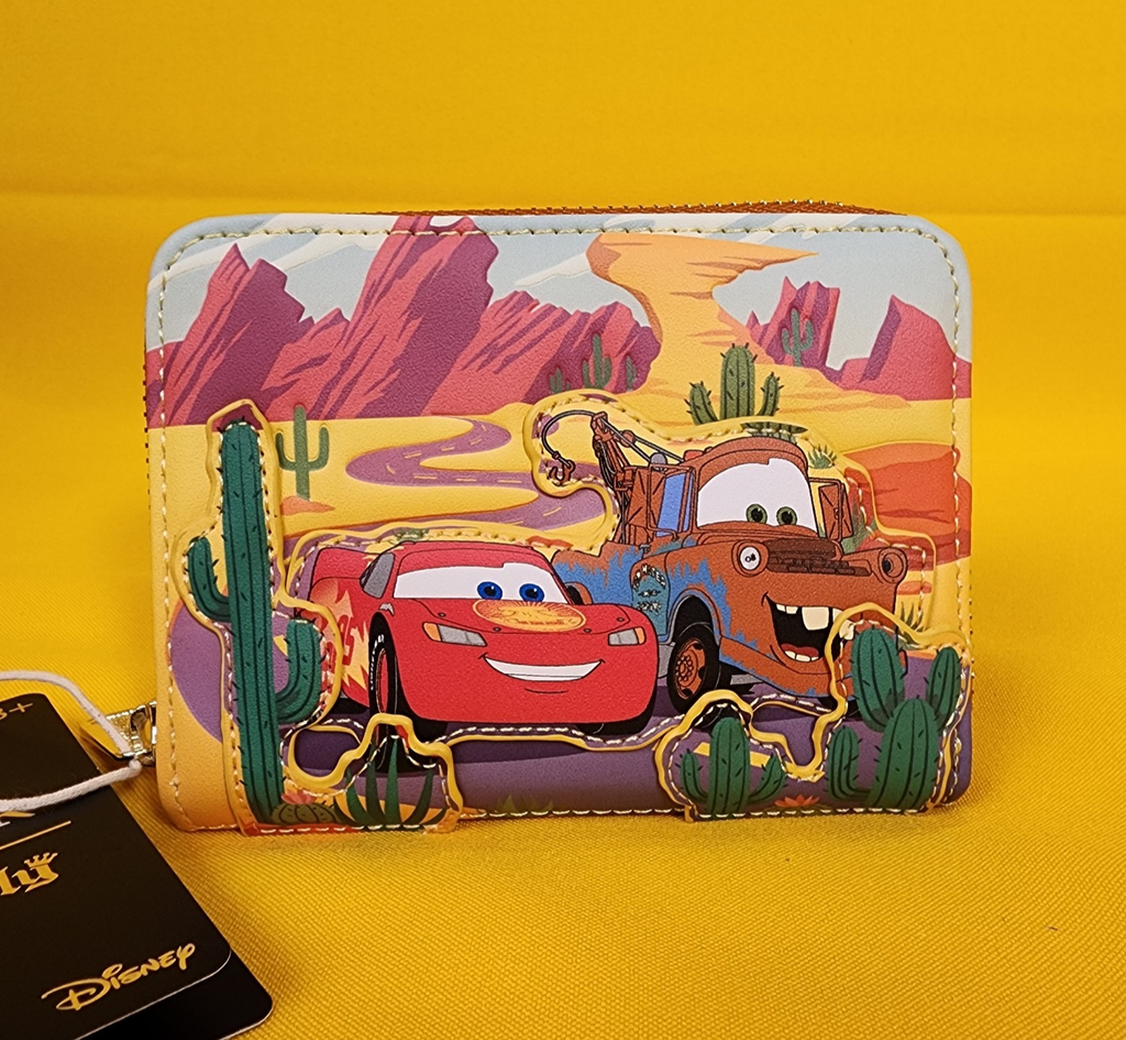 Rev up your engines with this Loungefly wallet! This Cars accessory stars Lightning McQueen and Mater amid the gorgeous scenery of Radiator Springs.