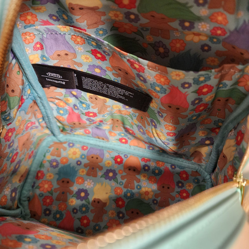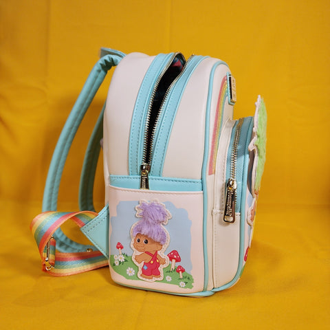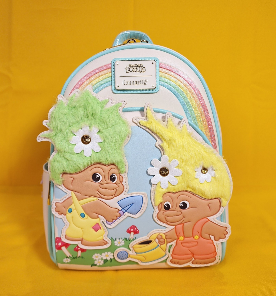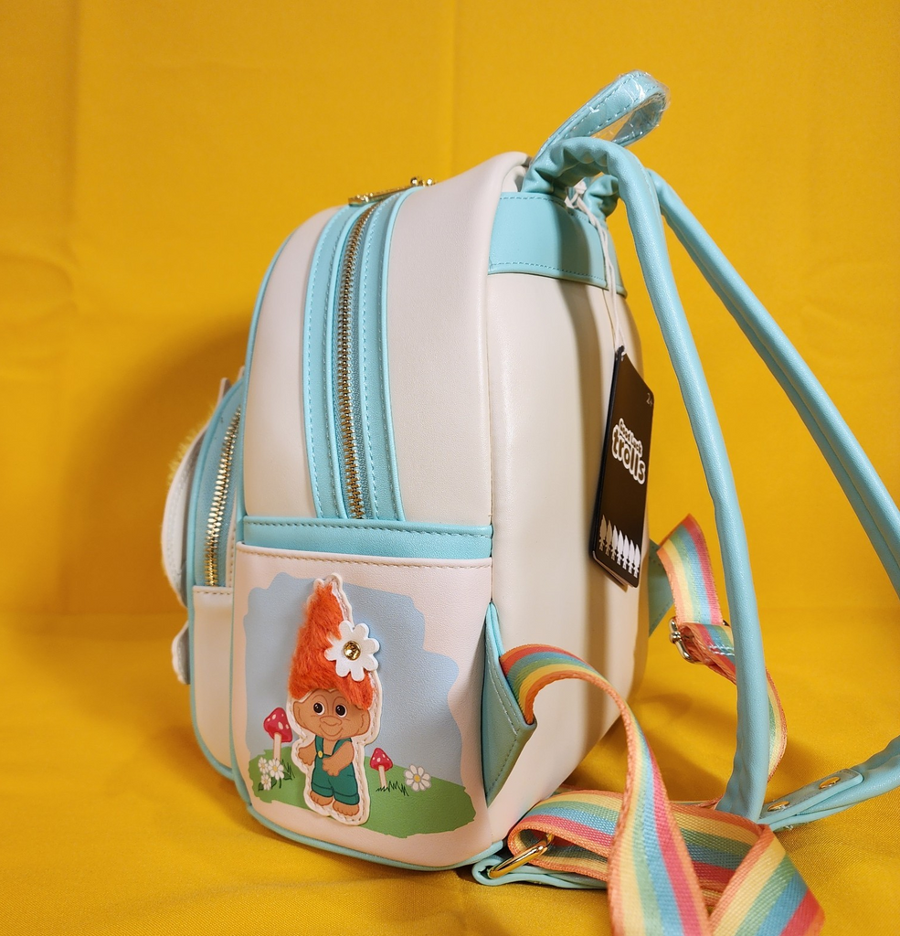 Add some good luck to your collection with this mini backpack! Featuring appliques of Trolls with faux fur hair on the front pocket, the body includes an embossed glitter rainbow. With more Trolls with hair on the side pockets, this bag is perfect for a day outdoors.