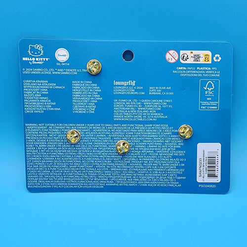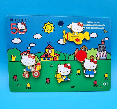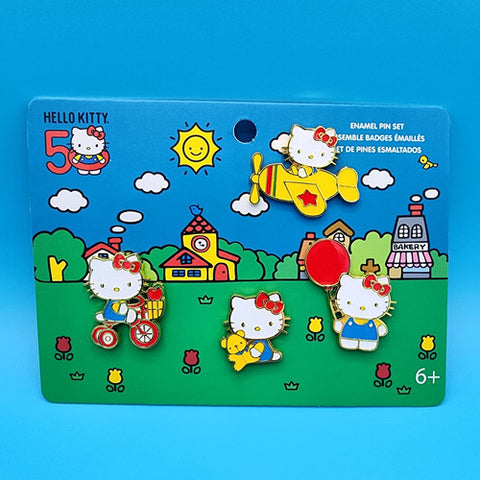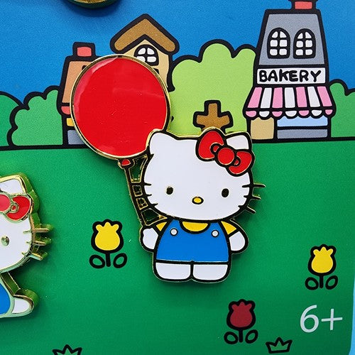 Passing through town? Share smiles all around! Make friends with our Loungefly Sanrio Hello Kitty 50th Anniversary Classic 4-Piece Pin Set. This enamel pin set features Hello Kitty with a balloon, on her tricycle, in a plane, and hugging a teddy bear. Grab this sweet Hello Kitty Pin Set and put it on your hat, bag, jacket... or wherever you please. Gift this to someone special..or add it to your collection!