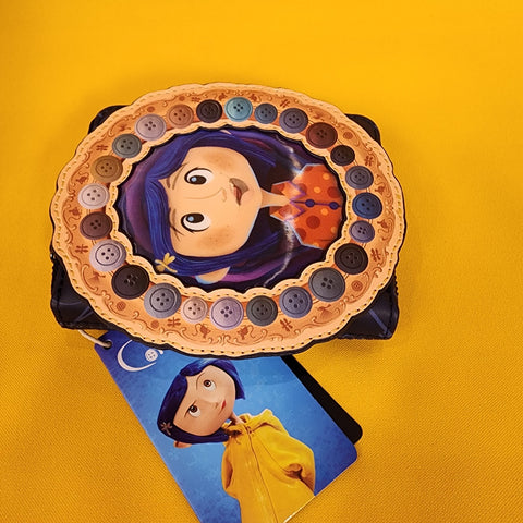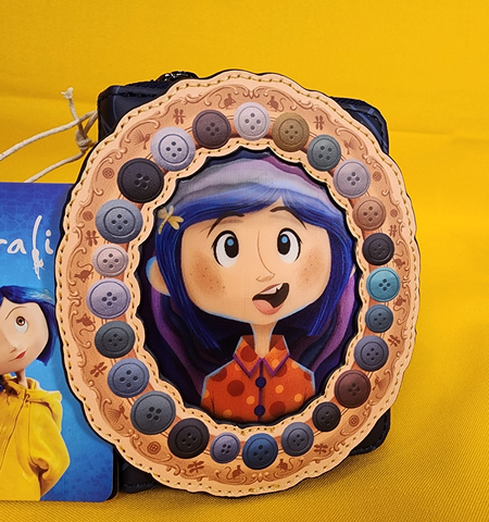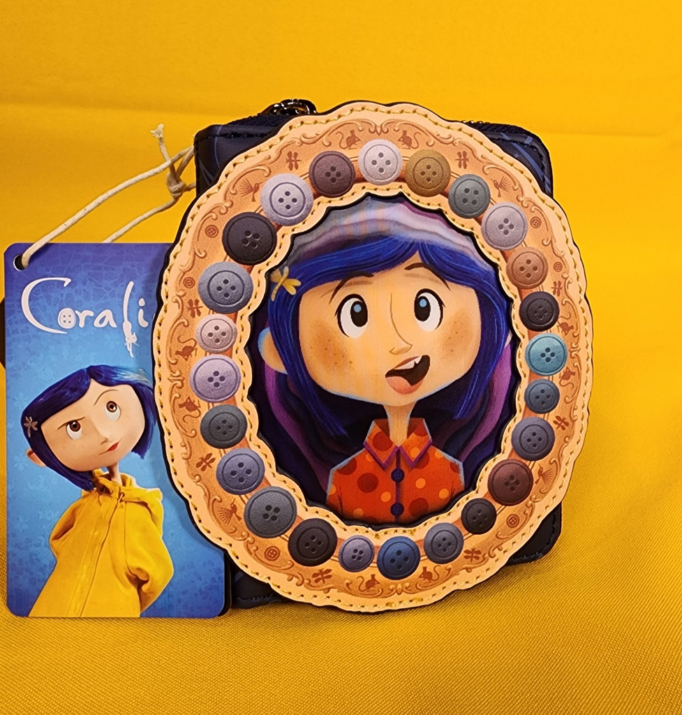 This Coraline wallet came straight from the Other World! Fitted with embossed details, this accessory stars a lenticular Coraline within a button frame, backed by spooky icons from the film.