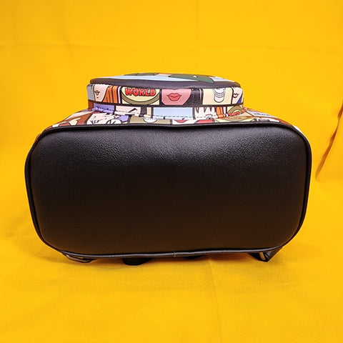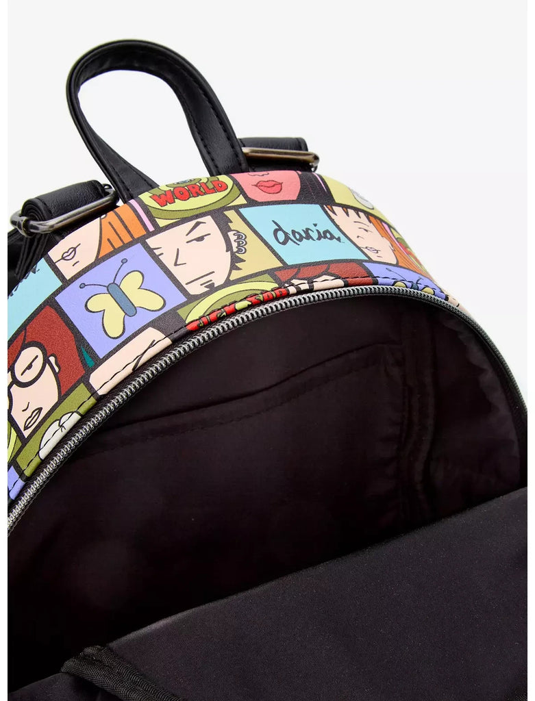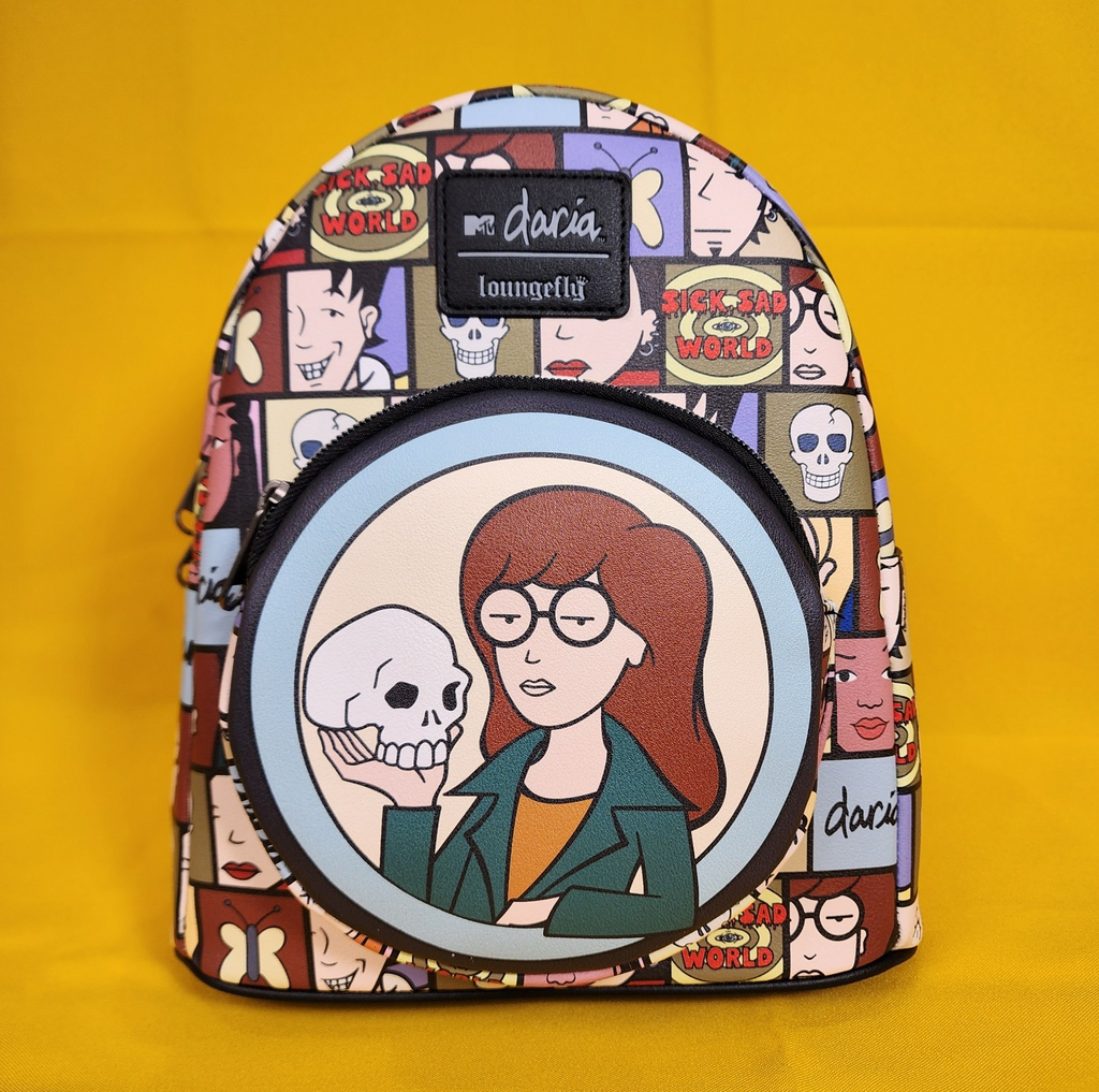 Get outta the suburbs with your essentials packed into this Daria mini backpack! Featuring a grid design with characters and icons from the show, plus a circular front zipper pocket with Daria holding a skull. Comes with adjustable straps, interior drop pocket and a top carrying handle.