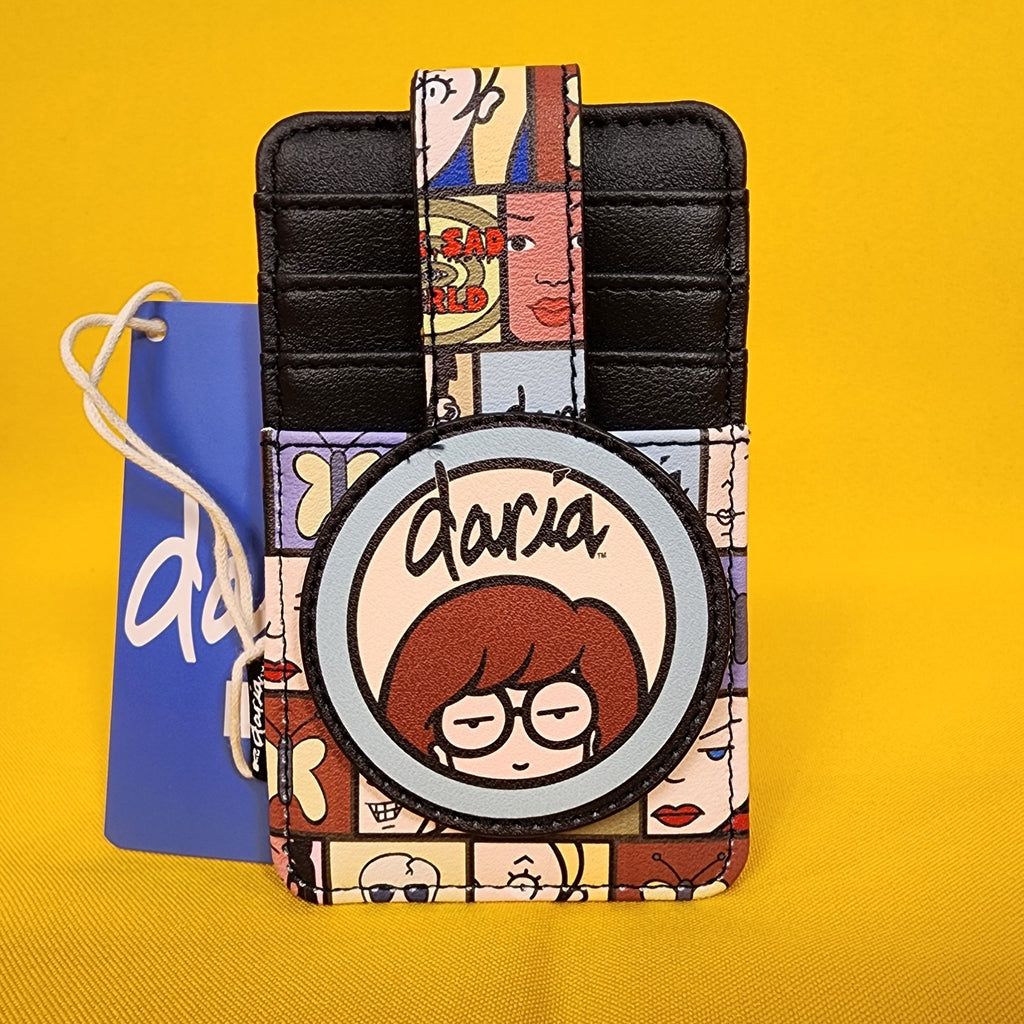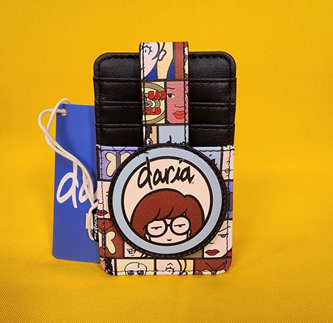 Get outta the suburbs with your essential cards packed into this Daria cardholder! Featuring a grid design with characters and icons from the show, plus a circular front strap with Daria peeking over. Comes with 4 card slots and clear ID slot on the back.