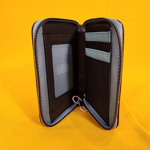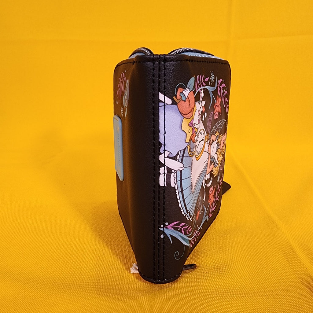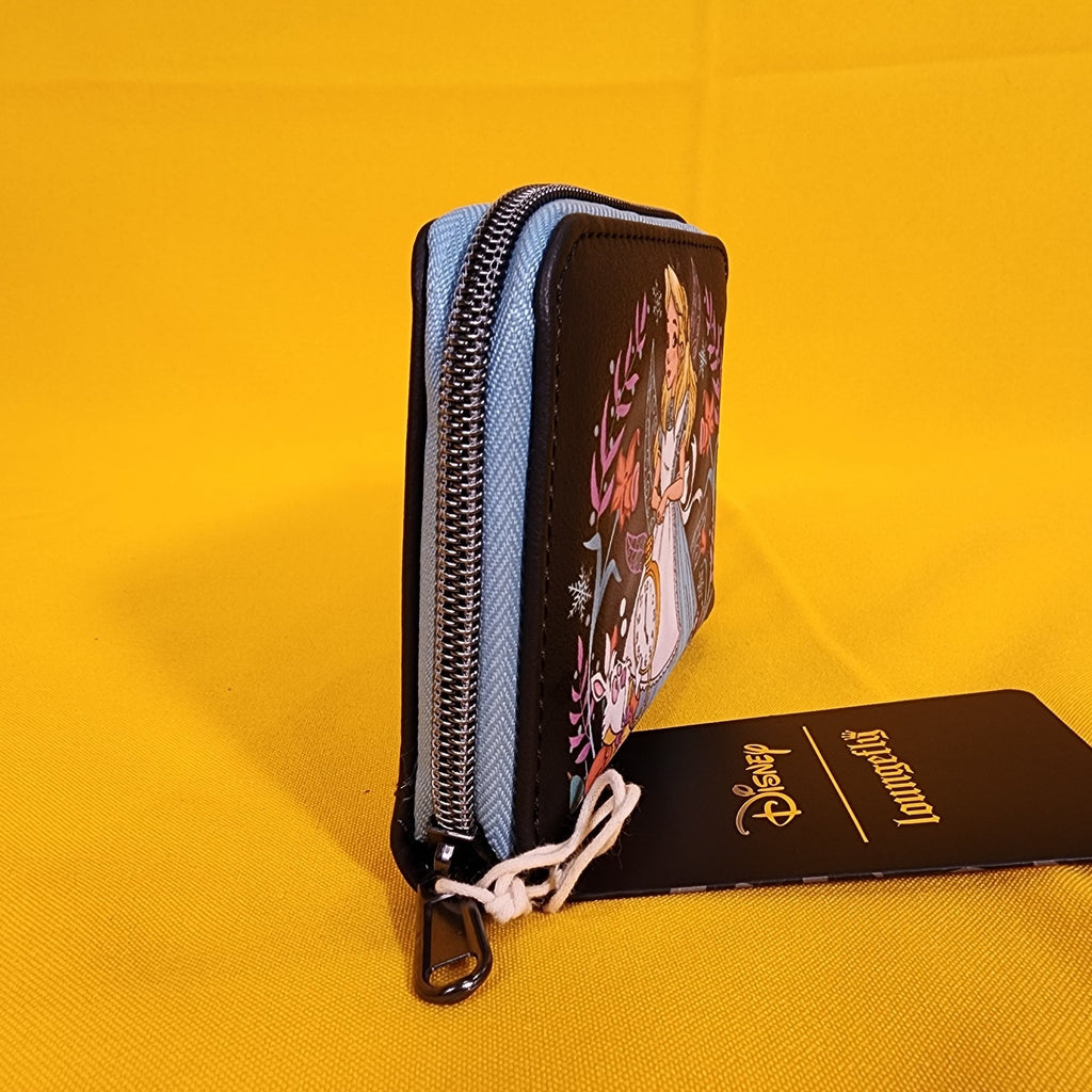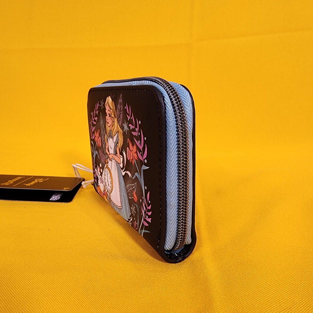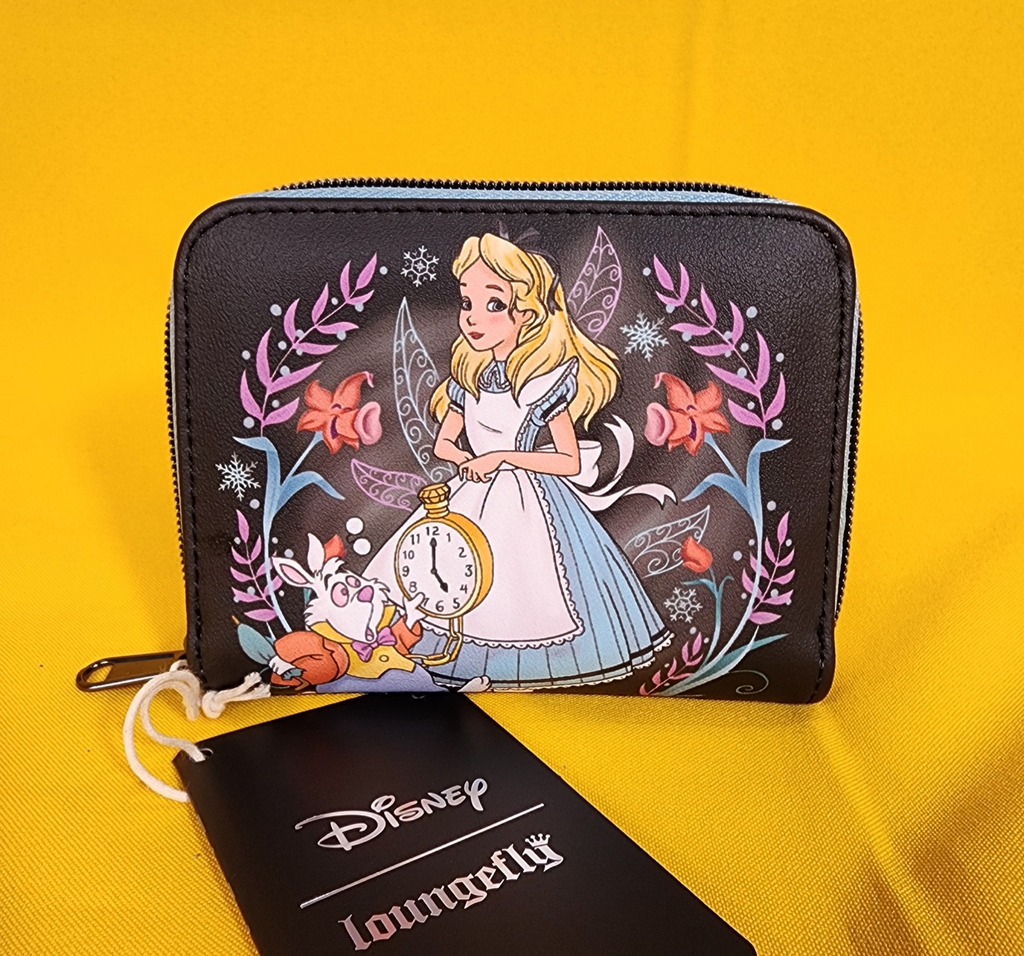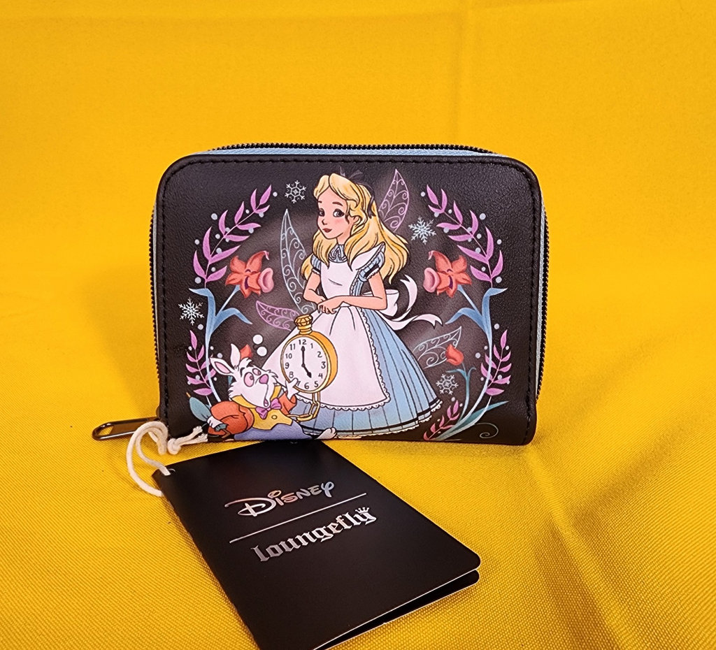 Fall down the rabbit hole with your essentials all packed! This Alice in Wonderland mini zipper wallet features flowers and snowflakes framing Alice and the White Rabbit. Comes with 4 card slots, clear ID slot and zipper closure.