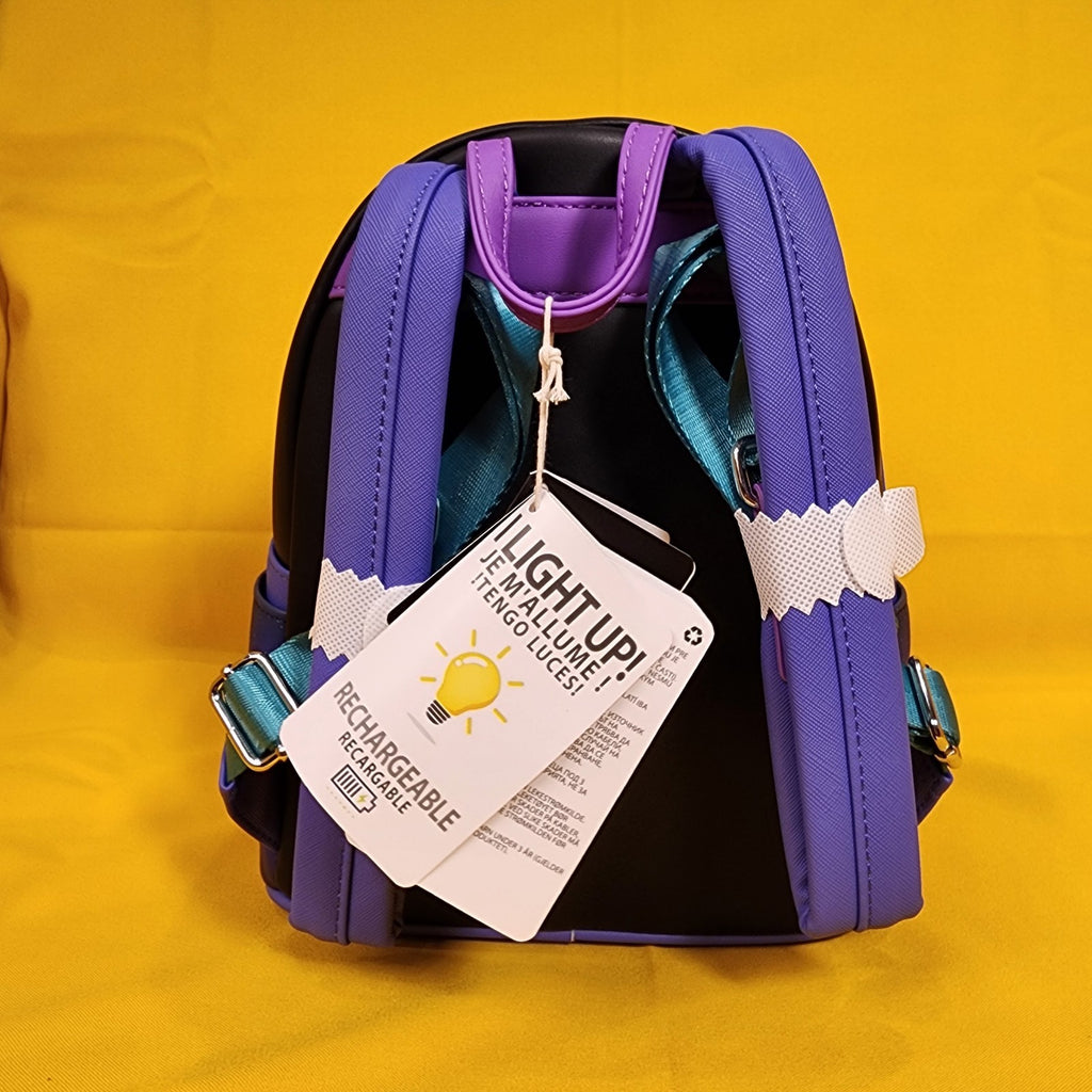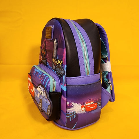 Rev up for Radiator Springs with this Cars mini backpack! Amid appliques of local stores, Lightning and Sally pose on the front pockets with light-up headlights. Battery Pack is USB rechargeable!