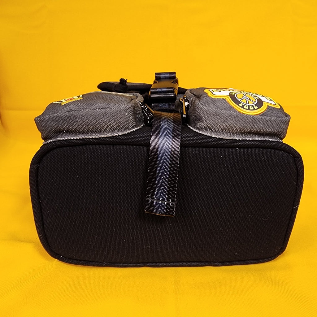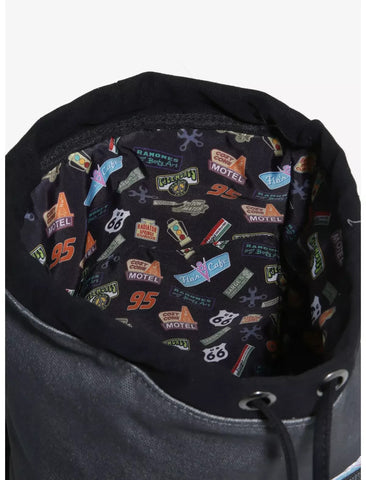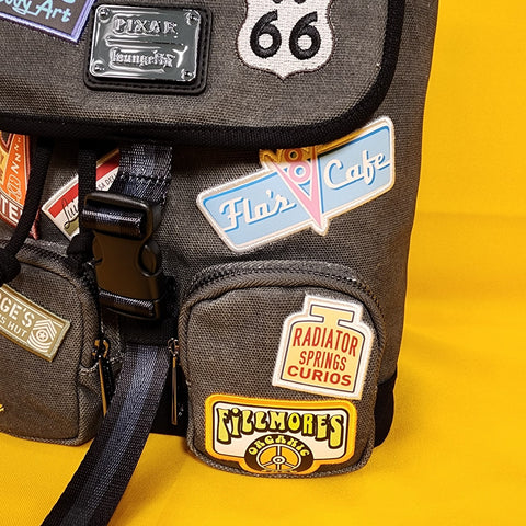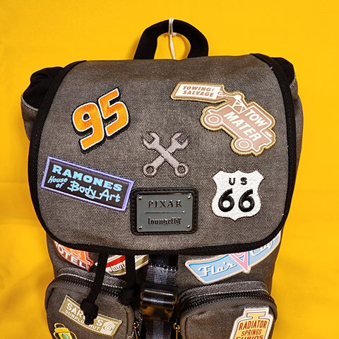 Pack up for your next road trip with this Cars mini backpack! Covered with patches of the shops in Radiator Springs, the front of this bag includes two zippered pockets and embroidered tool details. With a cinch and buckle flap closure, this bag is perfect for keeping your items secure.