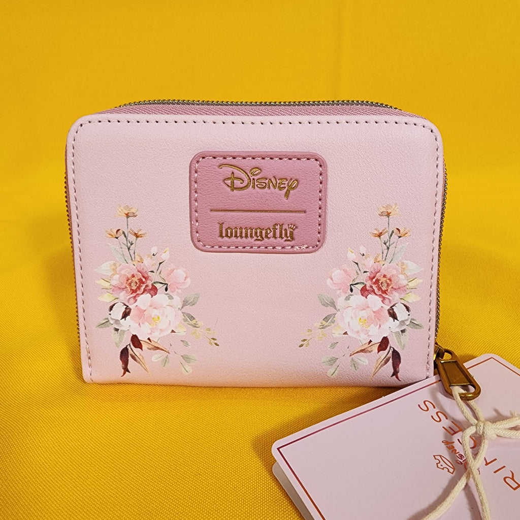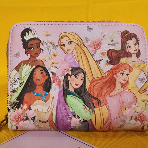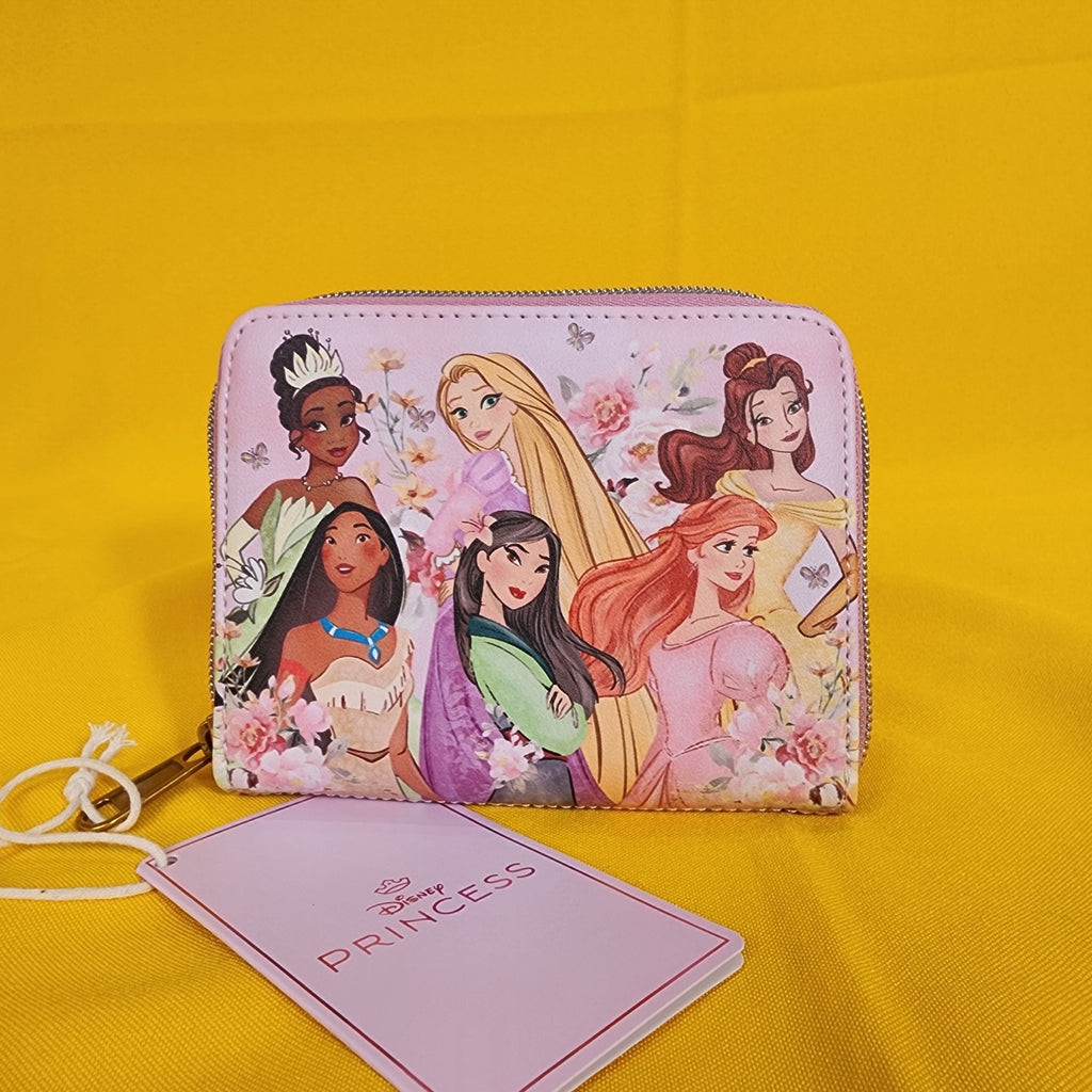Think pink with your favorite Disney heroines! This mini wallet features a floral print and your favorite Disney princesses, Tiana, Rapunzel, Belle, Pocahontas, Mulan and Ariel! Comes with 4 card slots, clear ID slot and zipper closure.