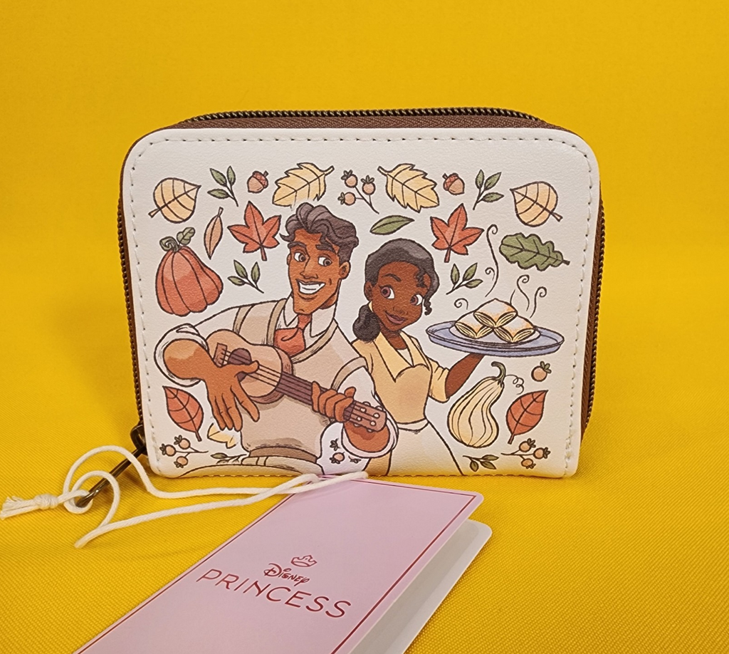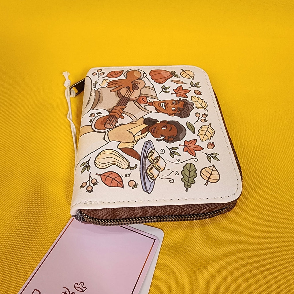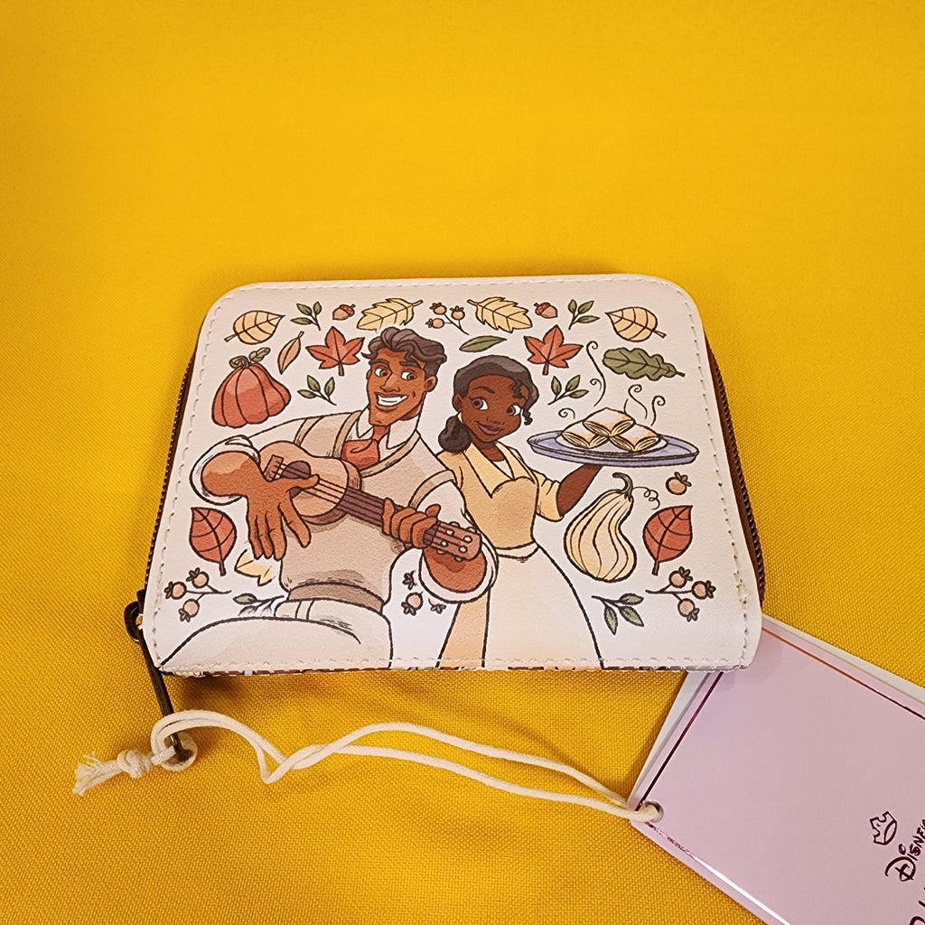 Tiana and Naveen from The Princess and the Frog are ready for fall! This cute mini zip wallet shows a portrait of the two characters surrounded by fall gourds and leaves. Tiana is holding hot beignets and Naveen is playing guitar. The other side shows an allover print of fall leaves, gourds and cooking equipment. Inside, there are card and cash slots, plus a clear ID display.