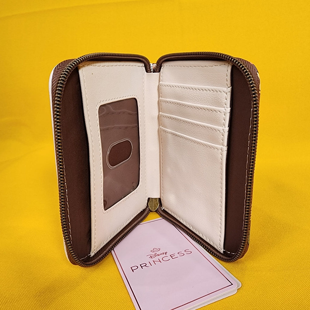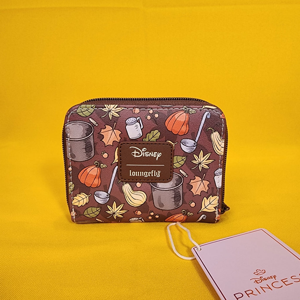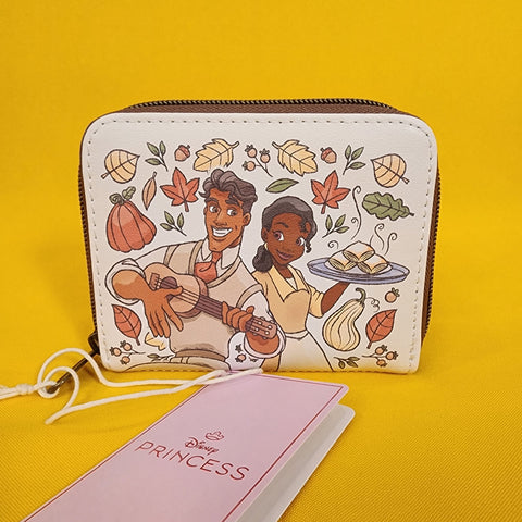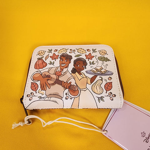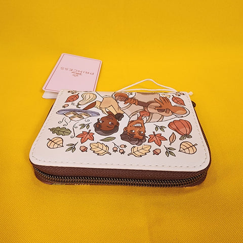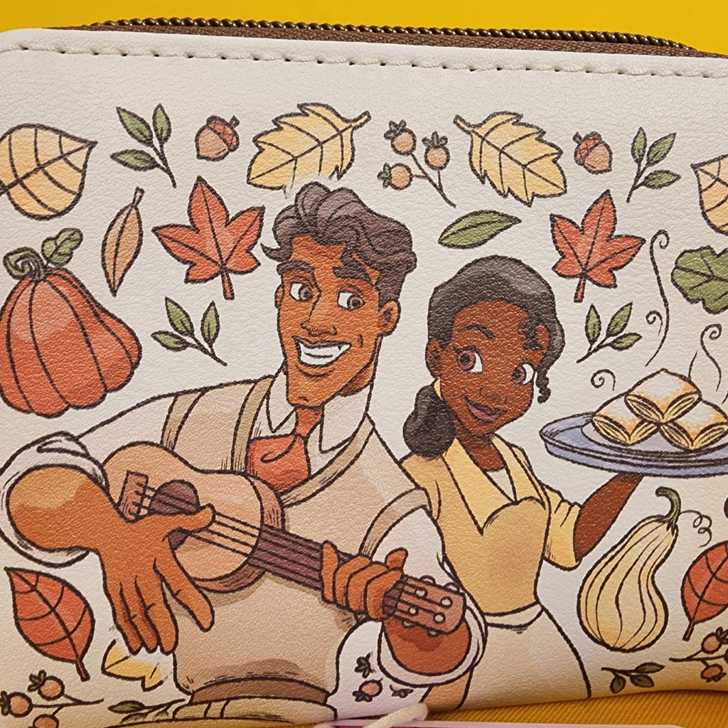 Tiana and Naveen from The Princess and the Frog are ready for fall! This cute mini zip wallet shows a portrait of the two characters surrounded by fall gourds and leaves. Tiana is holding hot beignets and Naveen is playing guitar. The other side shows an allover print of fall leaves, gourds and cooking equipment. Inside, there are card and cash slots, plus a clear ID display.