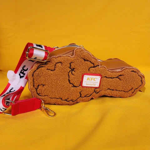 It's okay to scream over this sherpa drumstick crossbody, cause we are too! It is ICONIC. You want to make a statement with your outfit? Girl, go ahead and make it with this! This figural crossbody bag is in the shape of one of KFC's famous wings, covered in sherpa material, and embroidered for extra detail. The crossbody strap is covered in the KFC logo.