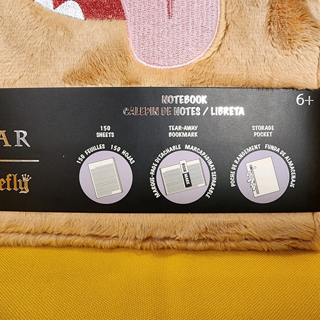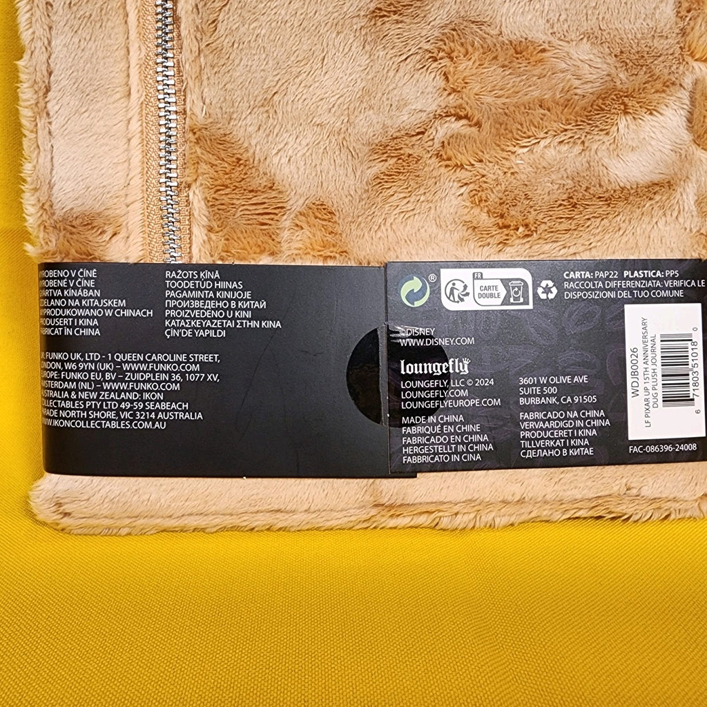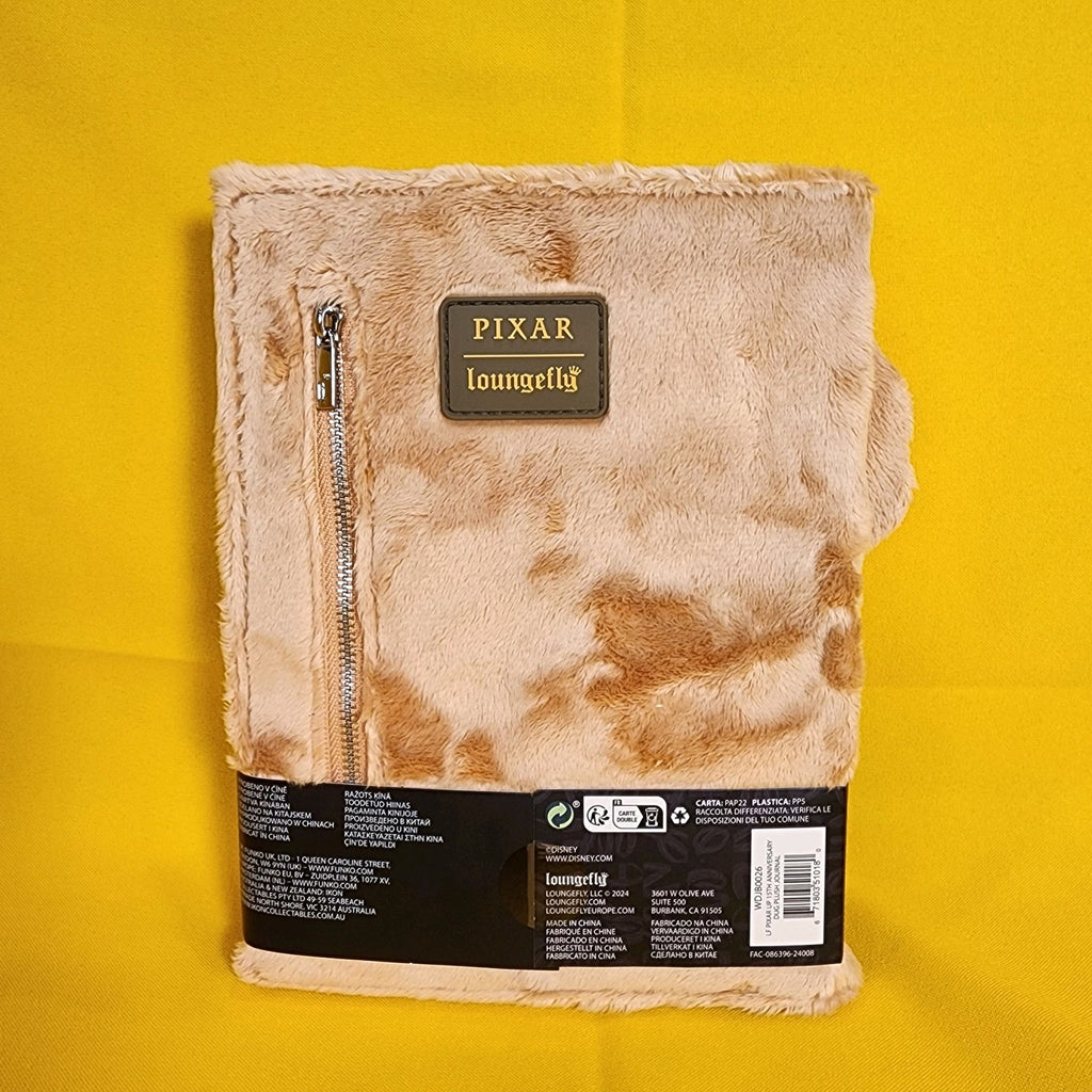 The Loungefly Disney-Pixar Up 15th Anniversary Dug Plush Journal is made of plush with vegan leather (polyurethane) trim. Journal features shiny gold hardware and applique, embroidered, textured, and printed details.