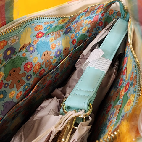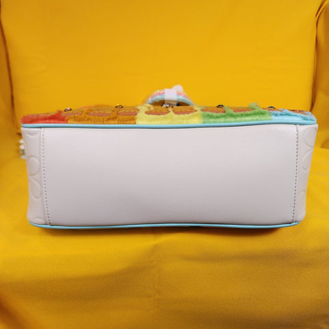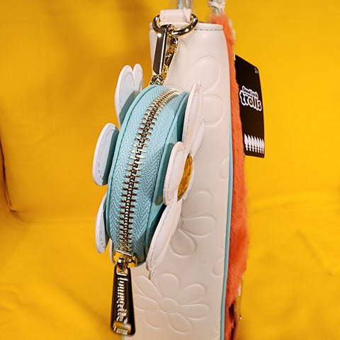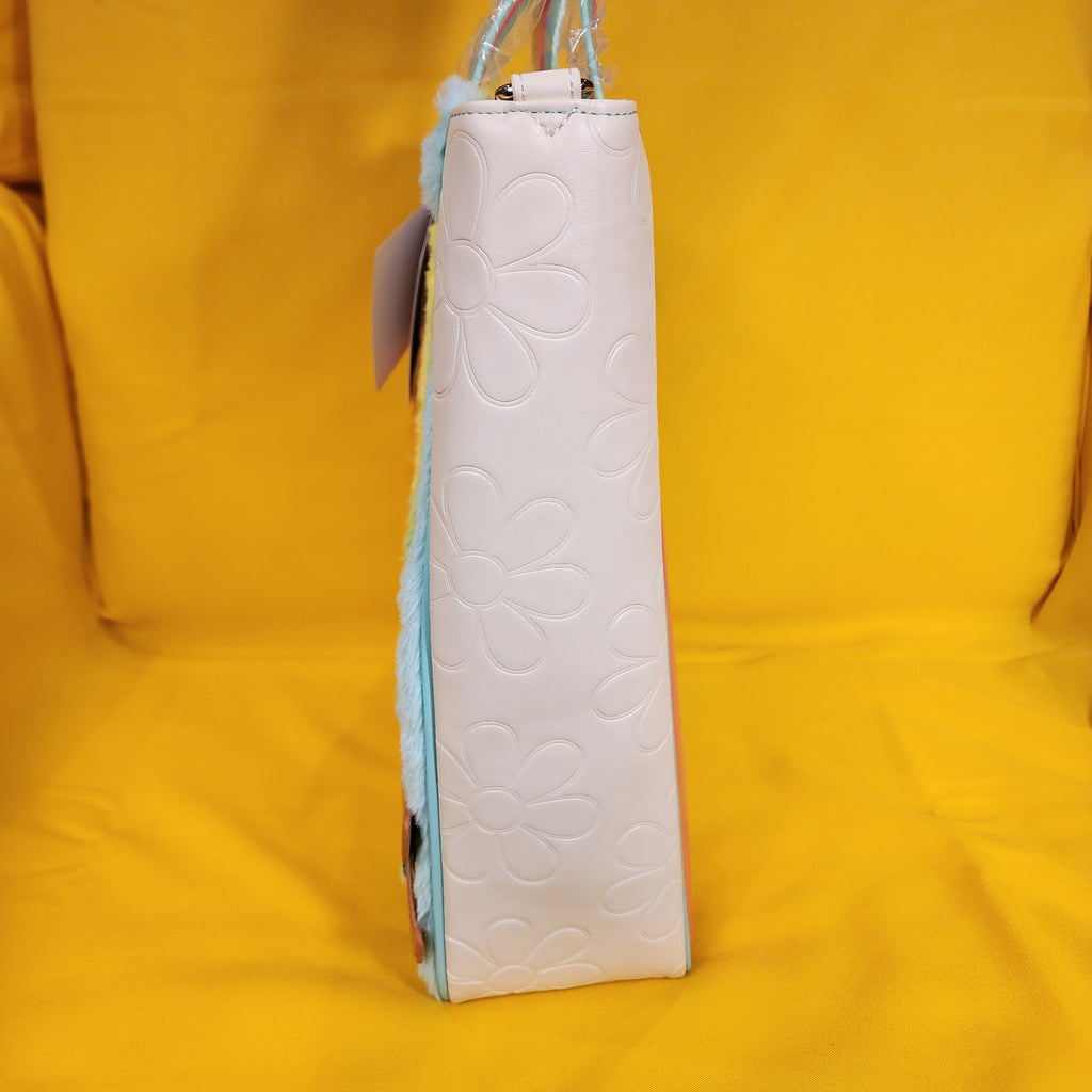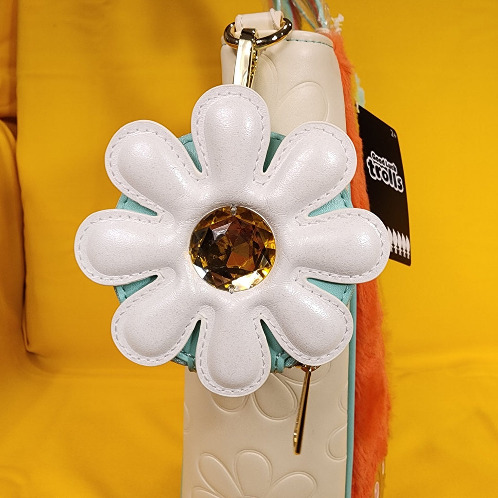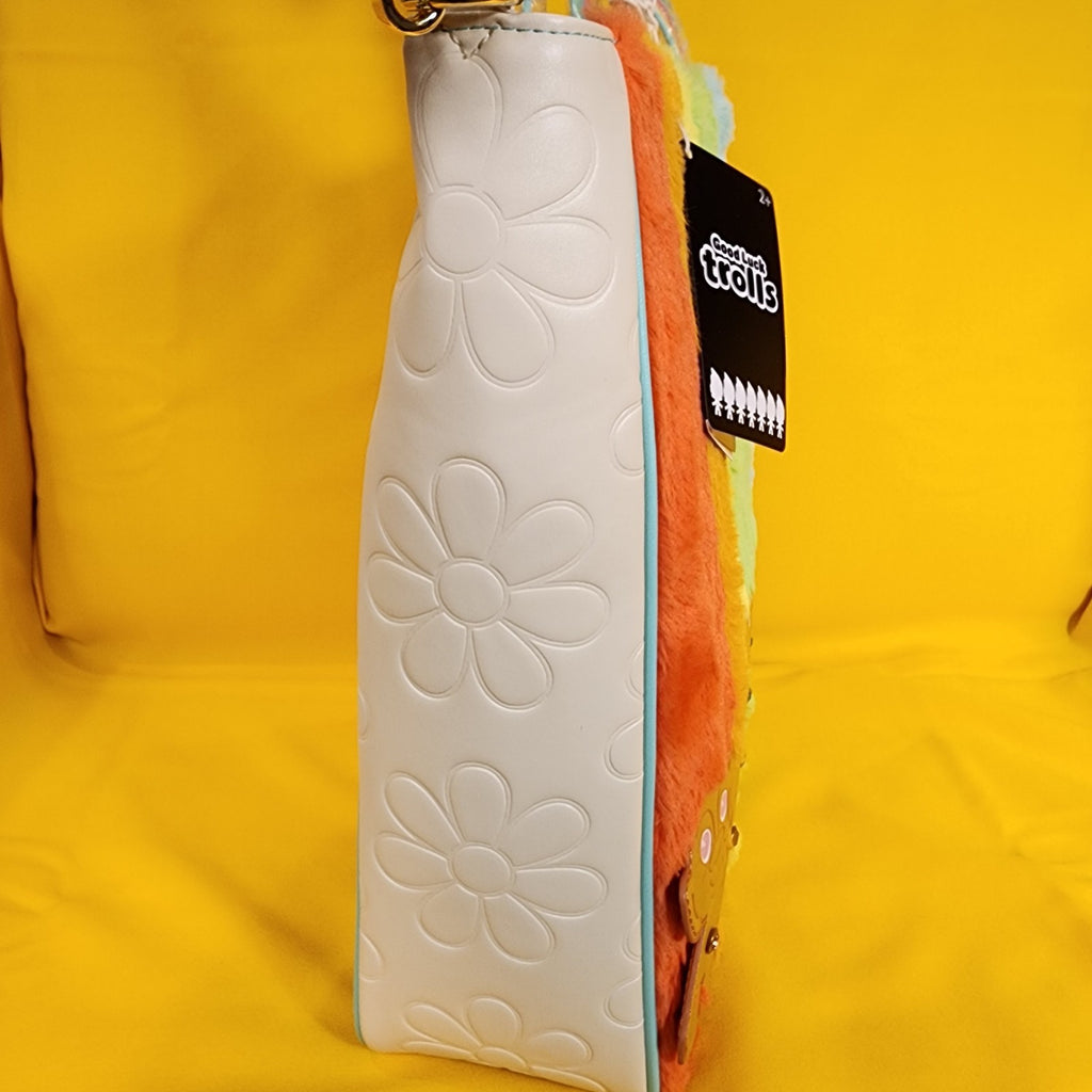 Find appliques of five trolls on the front of this tote with rhinestones on their stomachs. Faux fur hair in different colors stretches out above their heads. Rainbow coloring continues onto the handles of the bag. Attached to the bag, you'll find a glittery daisy coin pouch with rhinestones in the center.