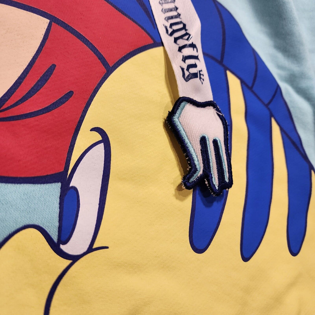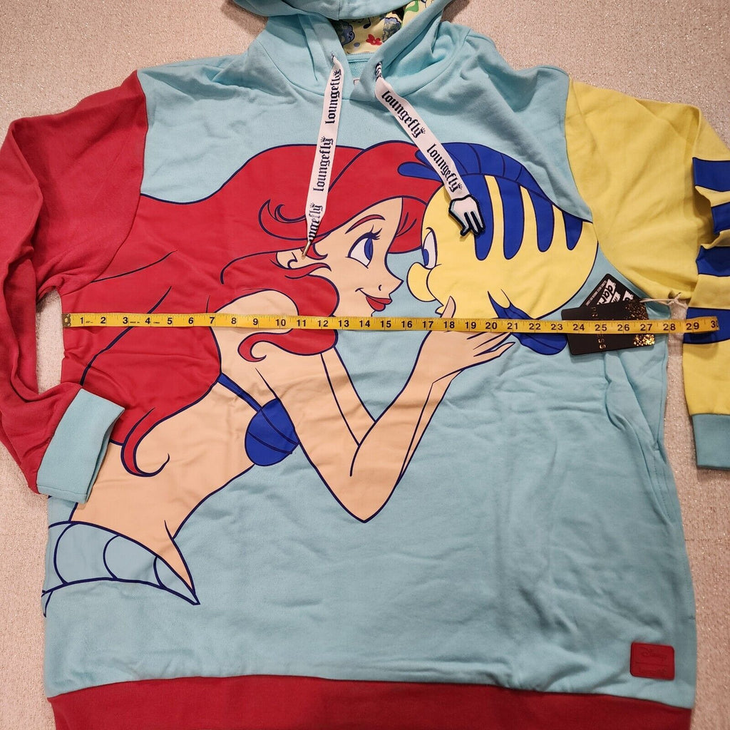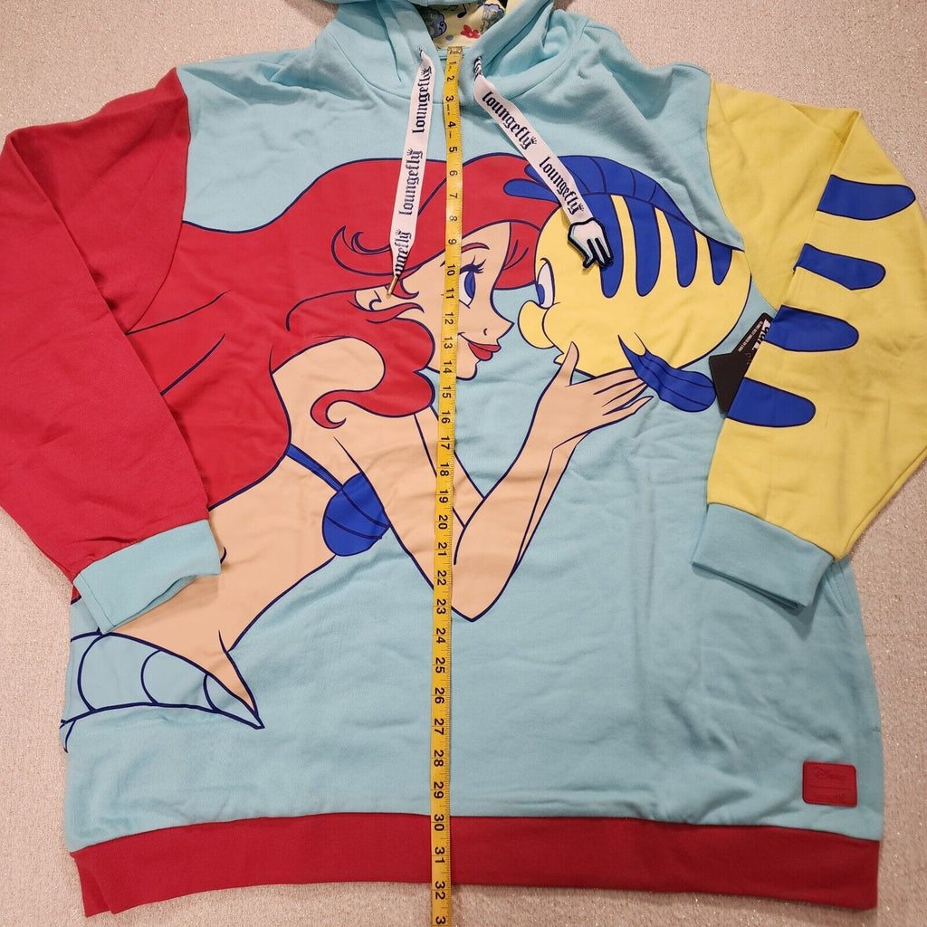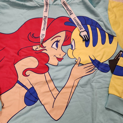 The Loungefly Disney The Little Mermaid 35th Anniversary Ariel and Flounder Unisex Hoodie is made of French terry fabric (60% cotton, 40% polyester; ribbing and cuffs: 95% cotton and 5% Spandex). Additional features include an extra-large, lanyard-style drawcord and a lined jersey hood.