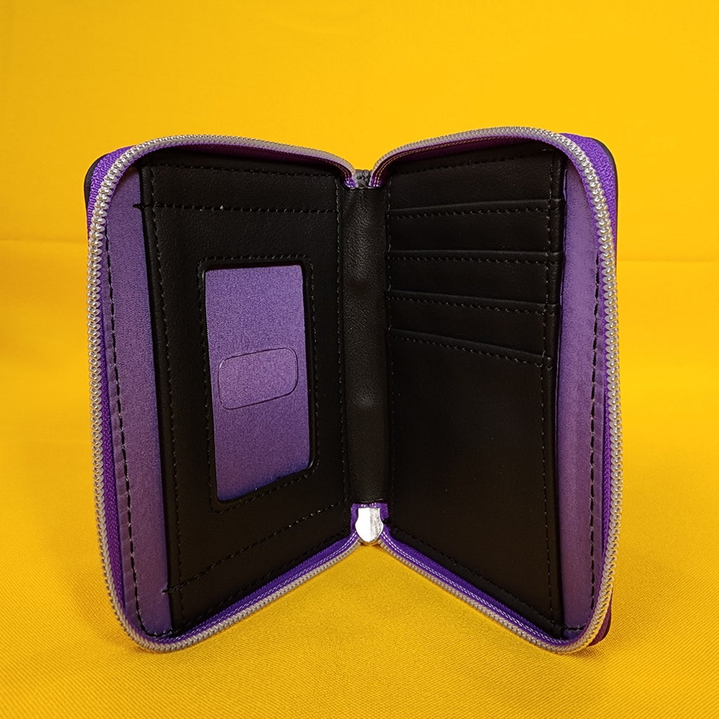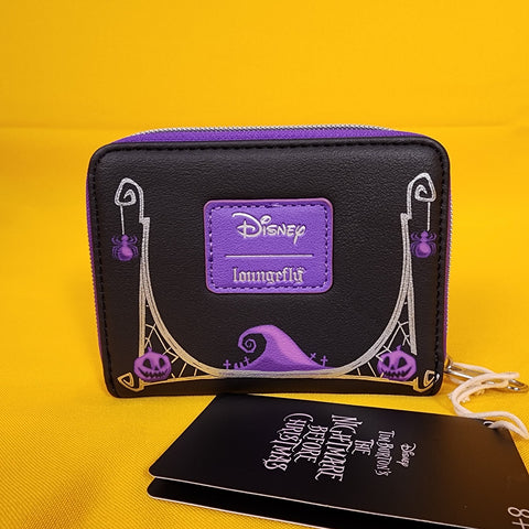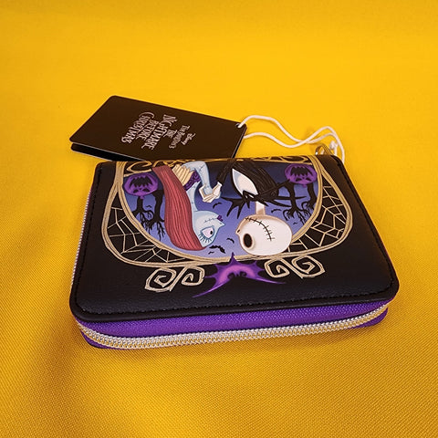 Creep into Halloween Town with these spooky sweethearts! This mini zipper wallet from The Nightmare Before Christmas features Jack & Sally holding hands and framed by purple pumpkins.